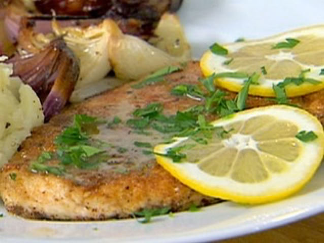 For the sauce, wipe out the saute pan with a dry paper towel. Over medium heat, melt 1 tablespoon of the butter and then add the lemon juice, wine, the reserved lemon halves, 1/2 teaspoon salt, and 1/4 teaspoon pepper. Boil over high heat until reduced in half, about 2 minutes. Off the heat, add the remaining 2 tablespoons of butter and swirl to combine. Discard the lemon halves and serve 1 chicken breast on each plate. Spoon on the sauce and serve with a slice of lemon and a sprinkling of fresh parsley.