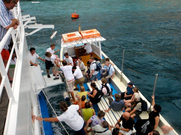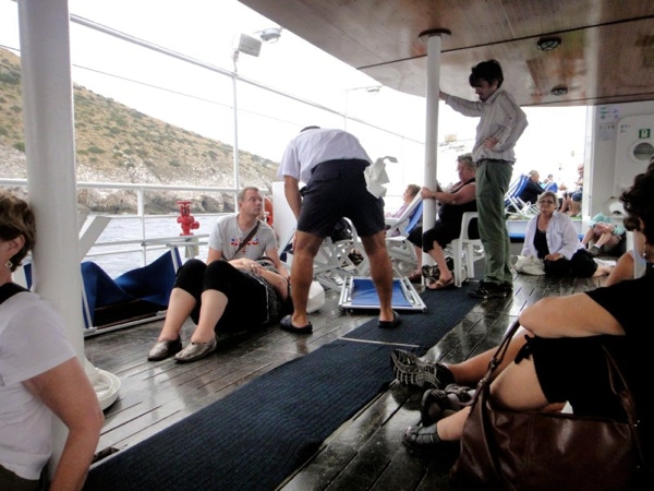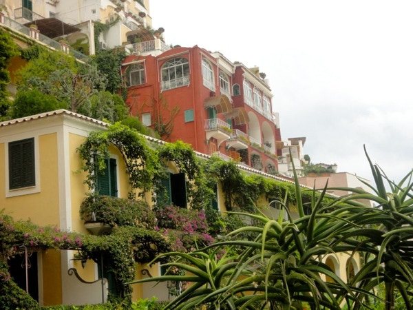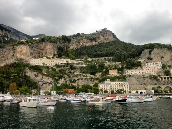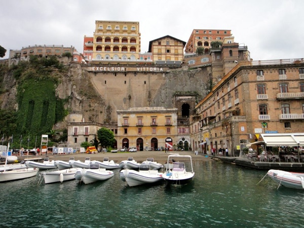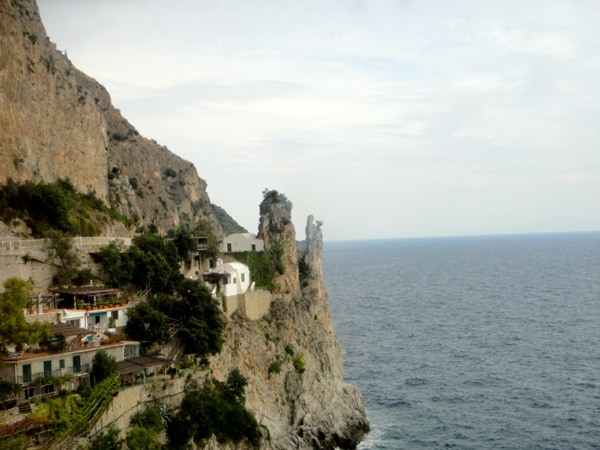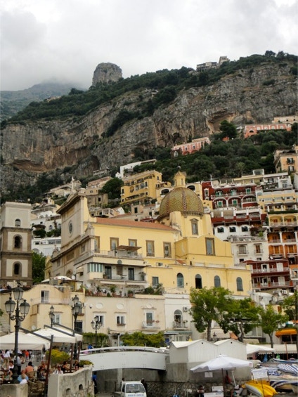 We woke up about 2:30 am and started reading, as we didn’t think we’d go back to sleep. We did, though, and didn’t wake up until 8:15. Now we feel we are on local time. The B & B serves a nice continental breakfast of juice, cereal, yogurt and pastries and as we ate we visited with a nice couple from Australia. The B & B is very basic, but is convenient to the town center and surrounded by lemon and lime trees. We left around 10:00 for the train/bus terminal and got in the queue for the bus that runs along the Amalfi Coast. Fortunately we got seats on the right side of the bus (with a view of the Mediterranean) and got some good pictures even while moving on the bus. This bus ride is said to be one of the world’s greatest, as the scenery is spectacular. We got off the bus in Positano after about an hours ride. Positano is about halfway between Sorrento and the town of Amalfi. Expensive women’s clothing stores, hotels and restaurants make up most of the businesses. It’s a long walk down to the harbor, but along the way is where most of the shops and restaurants are located. It started to rain lightly, so we stopped and had a salad for lunch. The rain stopped and we walked back up to the bus stop where we met a couple from Grass Valley CA. The bus ride to the town of Amalfi took about 50 minutes. We had hoped to catch a 5:00 ferry back to Sorrento, but found the last one left at 3:30, so we had almost no time in Amalfi town. The ferry ride is about 2 1/2 hours from Amalfi to Sorrento, and we were looking forward to a relaxing trip. After stopping in Positano for more passengers (they couldn’t dock the ferry and it was tricky getting the passengers on from their small boat), the seas got even rougher. Barbara decided to take some video of the action, but soon after she started the video the boat lurched and tables, chairs and people went flying. The couple behind us barreled into us and then we rolled back into them. Everybody was on the deck and the crew instructed everyone to stay sitting on the deck until the seas were calmer. They collected all the tables and chairs, so we had no choice. One lady was obviously injured, and there was an ambulance waiting for her when we docked in Sorrento. A few people got sick, so they were busy swabbing the deck. After about 20 minutes we did get into calmer water and the adventure ended. Thankfully we were okay and can now watch the short video (see above) of the rough seas and laugh. We went back to the B & B to change clothes, then went to a nearby restaurant. We ate risotto and calamari and drank an entire bottle of wine. We hope for a less exciting day tomorrow.