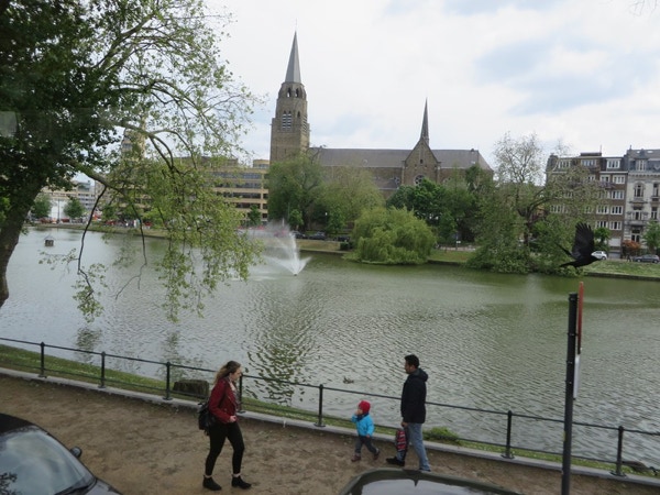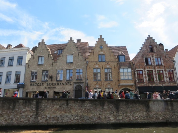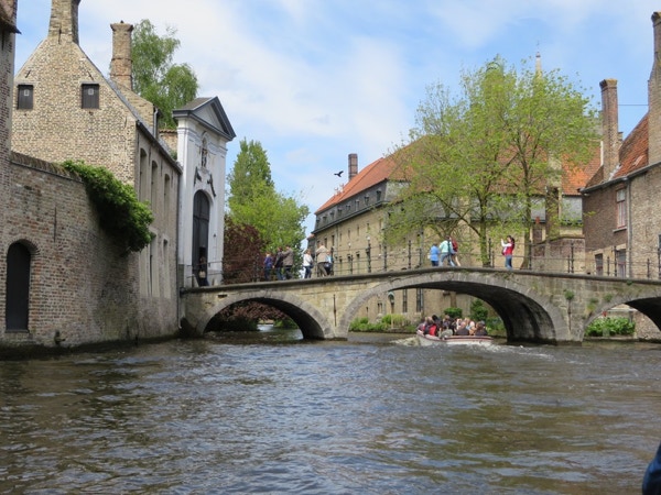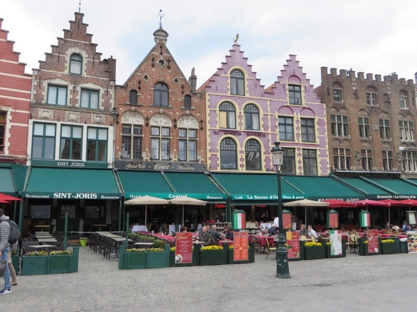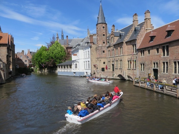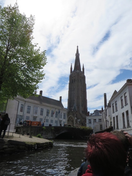 We had planned to eat breakfast at the Welcome Hotel in Brussels, but they had a water pipe break and the manager suggested a place a couple blocks away. The eggs and bacon were fried together and didn’t come apart unless you cut them. They were served with a delicious baguette and coffee for only €7. We packed up and left about 10:30 for what we thought was about an hours drive to Bruges. We were slowed down for a long time and finally saw that something had taken out a section of guard rail on the A10 in the opposite direction. The traffic backed up in that direction was about 10 km long. When we got to Bruges, the navigation system was hard to figure out. It would say first right at the roundabout, or stay left at the fork, and we hadn’t seen any roundabouts or forks! It did get us to the Botaniek Hotel, and to our surprise our room was ready. Veronica and Brend are the managers/owners (?), and are very nice. Brend, the husband who’s from the Netherlands, loves to chat about Bruges. Our room is tiny but charming. We unloaded our bags and drove the car a short distance away to an underground car park. The day was sunny and nice, so we decided to do the canal boat trip first. It lasted about 30 minutes, with the driver doing commentary in several languages. It was a very pleasant boat ride, although you lost the sense of where you were as there are many canals, turns and bridges. The lady next to Jay had a striking hair color—a wine color that you can see in a couple of pictures. After the boat ride we walked around trying to find a pub where Rick Steves suggested we have a Straffe Hendricks (strong Henry) beer. We found it, but it wasn’t going to open for another hour, so we backtracked and ended up having a Bleu Cheese Madness burger at Ellis Gourmet Burger. We ordered the Belgian fries (served with mayonnaise instead of ketchup) and Stella beer to go with it. Very tasty. We then walked around the Market Square looking for a good chocolate store. We bought a box of mixed chocolates at la Belgique Gourmande. They’re very good and probably won’t last long. By late afternoon it started to rain, so we went back to the hotel, intending to rest a bit before going out for dinner. Our legs are aching and we’re not very hungry after all, so may just have a quiet night in our room. The wifi has worked well both in Brussels and Bruges, and it’s so nice to have after using the internet on the ship.
