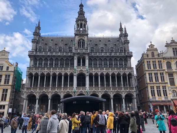 We got an early start this morning and left the ship around 7:30. The HAL shuttle got us from the port in Rotterdam to Schiphol Airport in Amsterdam in a little over an hour. We picked up a car, a silver Alfa Romeo Giulia, from Hertz. It’s okay—the seats are more comfy than our Prius but it has some quirky features. The built-in navigation got us where we were going today but it’s tedious to put in a destination. The weather was chilly with a steady rain almost all day. We first went to the Keukenhof Garden in Lisse, Netherlands. The number and colors of the tulips is amazing. There were huge crowds and the biggest danger was the umbrellas. We stayed for a couple hours and left for our hotel in Brussels, a distance of about 200 km. Before we left the gardens we discovered that Jay’s phone was missing. It’s a mystery as we had it in the car with us. We notified the Lost and Found at Keukenhof Garden but aren’t hopeful of their finding it. We’re staying at a funky little hotel in Brussels and the rain is making it unpleasant to be out. We walked to a nearby cafe and had Belgian waffles for dinner. Tomorrow we may have to find some sprouts (groan). The manager of the hotel told us they had snow in Normandy today. Wish we could trade this rain for the weather back home!