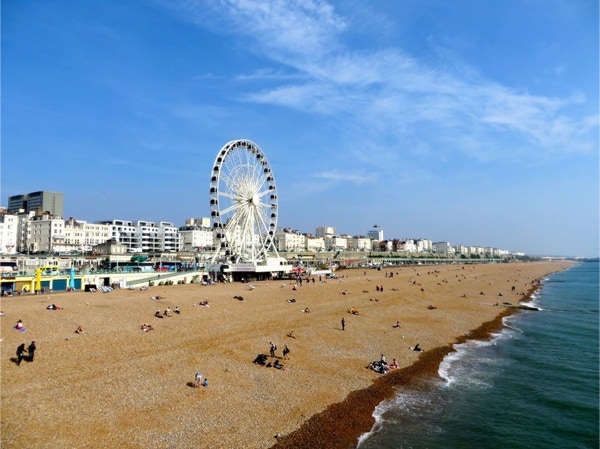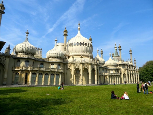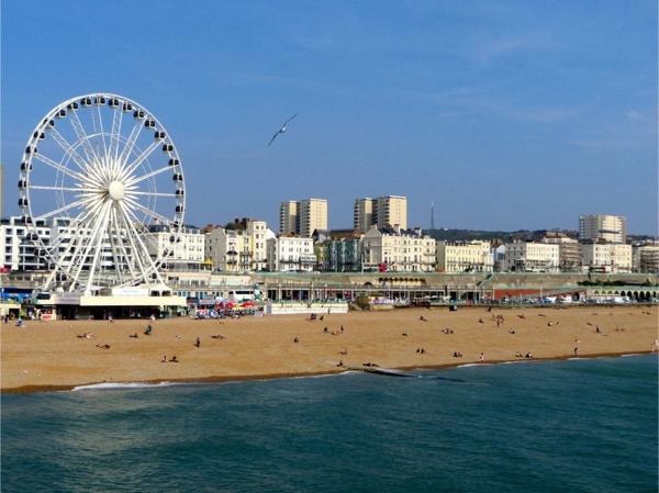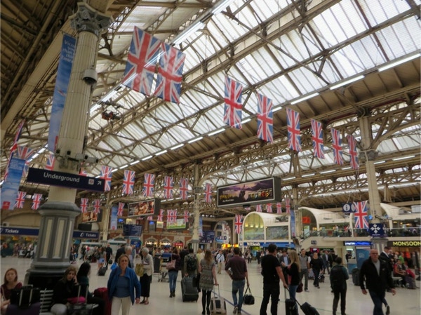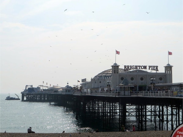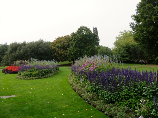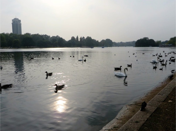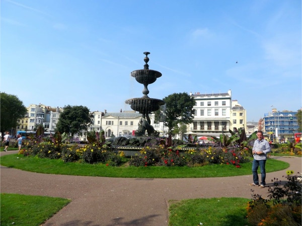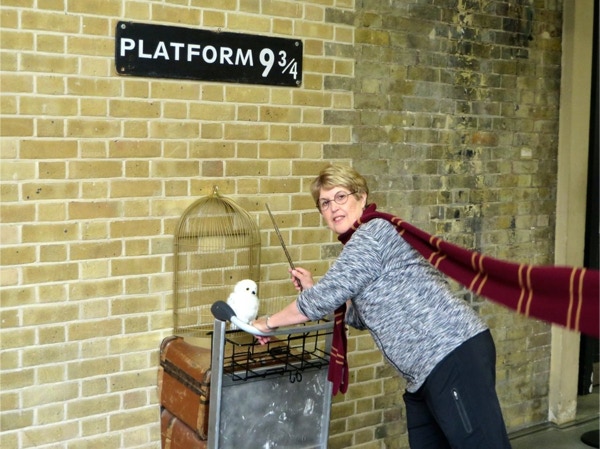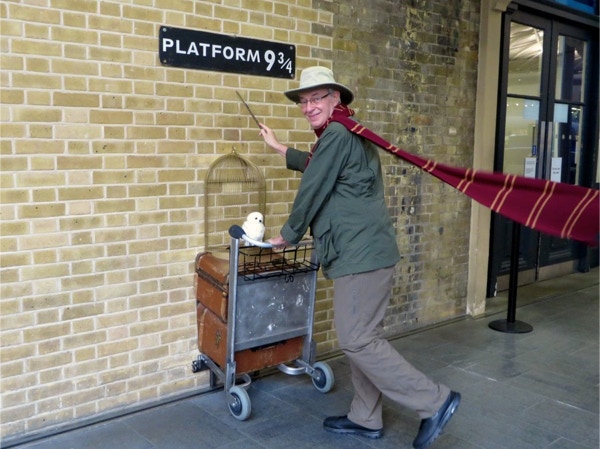 Today’s breakfast was pastries from the nearby Waitrose store and coffee in our room. Then we headed for the Lancaster Gate underground station where we bought a day pass. The first train was so packed the people were almost falling out the door. We got on the next train, where we were packed like sardines. We transferred to another line and went to the King’s Cross station where we had to look for some time for Platform 9 3/4. We were in a queue for awhile to get our pictures taken. The two gals were very patient, as most people got shots with their own camera instead of paying the exorbitant price for their photos. We were the oldest people there, and it was lots of fun. Next we took the underground to Victoria Station and bought train tickets to Brighton, the resort town on the English Channel. The train ride took about an hour, and Jay napped most of the way while Barbara read. We walked around Brighton for a couple hours, taking in the Royal Pavilion and the Brighton Pier. Brighton has a population of about 160,000 and there were a lot of tourists in town on this unseasonably warm September day. The people watching was great (saw a man in a bright green beard) and it’s a very dog-friendly place. The Royal Pavilion was built by King George IV, who wanted a vacation home by the sea. Napoleon was causing so much trouble that travel to the continent was difficult, so George could stay in England and entertain at his fancy home in Brighton. We walked along the Brighton Pier, through the arcade and had some ice cream before walking back to the train station. The return trip only took 45 minutes, and we got back on the underground and got off at Green Park. We hadn’t realized we were close to Buckingham Palace, so we went there and took some photos. The guards still look the same, but the real guys were nearby, dressed in black, and were carrying assault rifles. The walls around the palace have lots of dangerous looking coils of wire at the top. We walked next through Hyde Park, where the flowers were still beautiful. There were lots of ducks and swans on The Serpentine, a man-made lake in the park. We had walked almost an hour and a half since we got out of the underground, and logged about 10 miles total today. We were so pooped that we rested for a while and then just had dinner at the hotel—fish and chips and a pint of Stella. We had time to work on the blog before turning in.