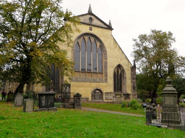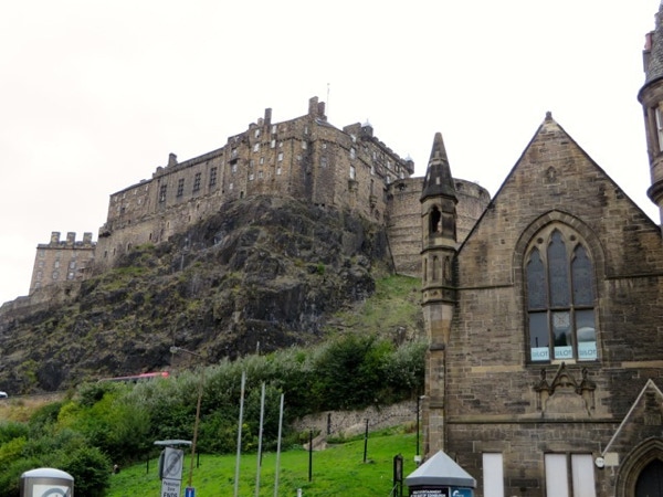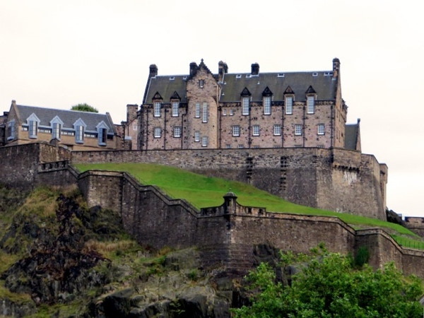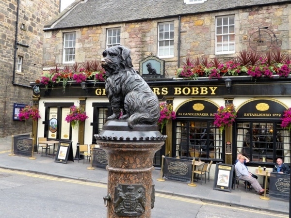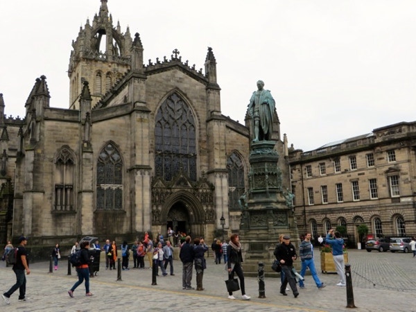 Aileen made us a tasty Scottish breakfast at 9:00, then we waited for Gayle and Jerry to arrive, as their plane from Belfast was delayed. They got to the B & B around noon, and we left for the free walking tour that Gayle got tickets for months ago. We took the tram from Haymarket to St Andrews Square and walked to Starbucks where the tour began. Kim, our guide, was very knowledgeable but soft-spoken, so her narrative was often drowned out by guides around us. We spent about 2 1/2 hours seeing the exteriors of St. Giles Church, Edinburgh Castle, and the Greyfrier’s Bobby monument (Bobby was the Scottish terrier that reputedly stayed at the graveside of his master for 14 years—Kim said it was the most visited gravesite in the UK). Near Heriot’s school, where J.K. Rowling was supposedly inspired for the Harry Potter books, we saw the bagpipe marching band practicing. We also walked by The Elephant House, a small coffee shop, where Rowling spent a lot of time when she was in Edinburgh because she couldn’t afford to keep her small flat heated.