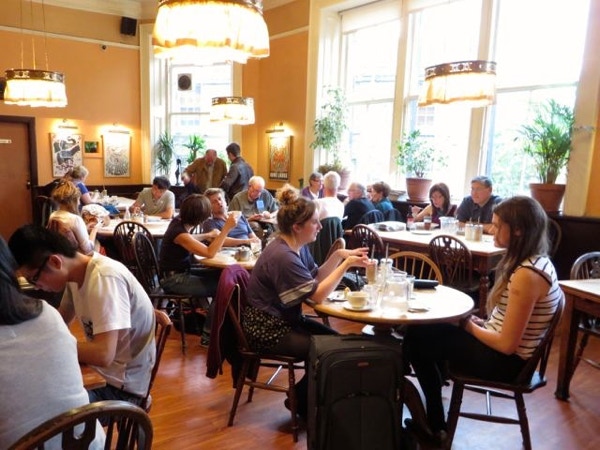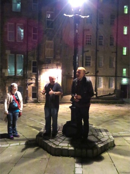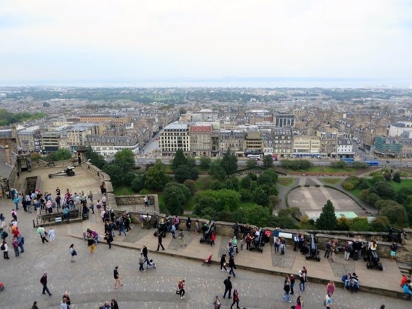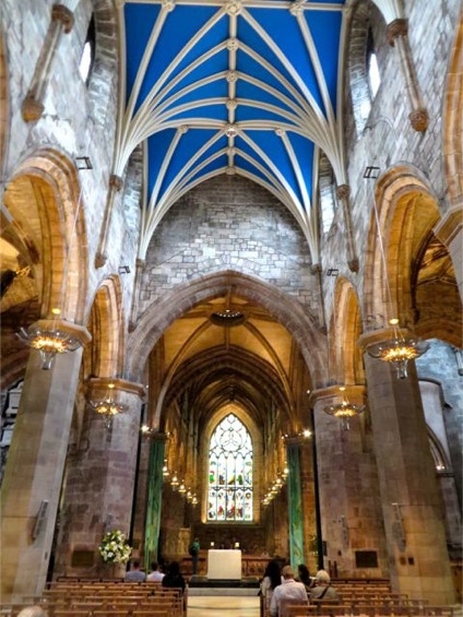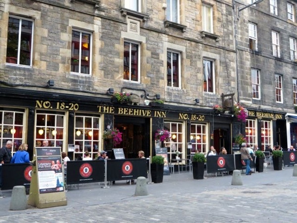 We left the B & B about 10 after another Scottish breakfast, and started walking to the Edinburgh Castle. Donal, our guide at the castle, was excellent and very witty. The guided tour lasted about 30 minutes, and then we were on our own to visit the big complex. We went through the Great Hall and the Royal Palace, which housed the crown jewels (no photos were allowed in that room). Mary Queen of Scots gave birth to her only son in the palace, and the area we saw contained living rooms with huge fireplaces and a dining room. The WWI Memorial didn’t allow photos, either, but the rest of the places did. We saw St. Margaret’s Chapel (tiny, seats about 17) and heard the big gun that goes off at 1:00 every day and formerly was used to tell the time to other parts of the city. There were no guns at the castle, which sits on a huge rock and was quite inaccessible in old times. Then Queen Victoria visited and insisted on having guns, so they put in naval guns, which would have wiped out civilian parts of the city had they ever been fired. We saw the Firth of Forth from the castle, which is the estuary of the river Forth. We stopped for a bite at the Redcoat Cafe, and then went our separate ways. Jay and Barbara walked along the Royal Mile and first stopped at St. Giles Cathedral, the most important church in Scotland. We took pictures inside—it’s very beautiful and the Robert Burns window is a highlight. Next we visited the Scottish Parliament, and went inside the MP chamber, as they were not in session. We also took a few pictures through the fence of the Palace of Holyroodhouse, which is the queen’s official residence when she’s in Edinburgh. Next we went through Holyrood Park (not much of a park by our standards) and then headed back toward our dinner meeting place. We stopped for about a half an hour at the National Museum of Scotland (free). It was an interesting place. Everyone got to the Elephant House about the same time, which is where J. K. Rowling started writing her Harry Potter books. We were shocked to see Jule and Jennifer sitting at a nearby table (they were at the Heatherdale B & B on the Isle of Skye). They were equally shocked when Jay went over to say hello. We saw them again at another restaurant a short time later. At 7:30, we went to the Beehive Inn for the start of the Literary Pub Tour. Two gents played adversaries—we walked around Edinburgh and stopped at several pubs, and they kept up a dialogue about the most famous writers from Scotland—Robert Burns, Sir Walter Scott, Robert Louis Stevenson and some guy named Ferguson. They also told the story of Deacon Brodie, the Scot who supposedly was the man Dr. Jekyl and Mr. Hyde was based on. In real life, Deacon Brodie designed a more efficient gallows, which was used, ironically, to hang him. The tour ended around 9:40 on Rose Street, so we walked about 45 minutes to get back to the B & B. In our 12 hour walk of Edinburgh today we logged about 10.6 miles on the pedometer. Every part of our bodies hurt, but Barbara’s head has been pretty pain-free in Scotland. Some dizziness, but that’s pretty normal. We finished off our whiskey and whiskey and cream and ate some chocolates before turning in.