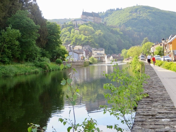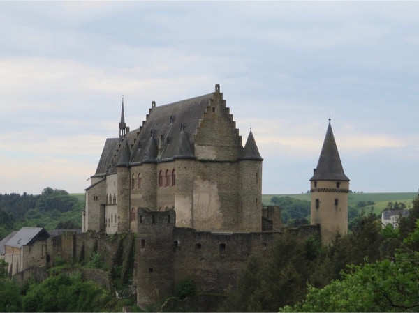 We had breakfast at the hotel and left about 10:00. Anne and Jeff—do you remember the time we were in Paris in the late eighties or early nineties and our hotel elevator was so small that we stayed on the main floor and you two went up the stairs and we sent the suitcases up one at a time? The elevator in Chartres may be a tad larger, but only holds one person with a suitcase at a time. It brought back those funny memories. We headed north out of Chartres in the direction of Paris. The sun was shining when we left but soon it became cloudy. As we got closer to Paris the traffic got very congested. We skirted around Paris and headed east to Luxembourg. and were on a divided highway, the A4, with little traffic. On the way was an exit for Verdun, the site of one of the costliest battles in history. It lasted over 300 days in 1916 and about 377,000 French soldiers and 337,000 German soldiers died. We may have stopped if we had more time. Barbara finished reading Less, a novel that just won the Pulitzer Prize. She started Stephen King’s book Sleeping Beauties, but it’s over 700 pages long so she probably won’t finish it on this trip. We arrived in Vianden, Luxembourg about 4 pm and it was sunny 72 degrees. It didn’t even make it to 60 degrees in Chartres yesterday, so the weather is much appreciated. The 6 hour ride was quite relaxing as it was mostly highway driving. Lunch was just some snack food in the car. We must have decided months ago when we made our hotel reservations that we would like a contrast to staying in hotels in city centres close to the cathedrals. Vianden is a small, laid-back town close to the German border that has a castle on the hill and a Victor Hugo museum, as he stayed in this town a few times in the 1800s. The house that he lived in for a while is a museum and maybe we can see it tomorrow, although Luxembourg City is our destination for the day. Vianden is about 30 miles north of Luxembourg City. The fellow at reception at the Belle-Vue Hotel where we are staying is also the waiter in the restaurant. We had dinner there and asked him if he was born here and he gave us his long history since his birth in Prague. He said he lived in Prague in his party years and went to study hospitality in Martinique in the Caribbean. Learning French was a requirement there so he taught himself. Now he speaks 8 languages and told us that French is the official language of Luxembourg although many speak a combination of French and German. Our room at the Belle-Vue is very large with a balcony. It has some amenities that we haven’t seen for a long time—an elevator with a capacity of 8 people, a bathroom that would hold 10 people (and has washcloths), a shower that would accommodate about 10 bodies, lots of space for luggage, lots of outlets to charge all our electronic devices, a big closet and small refrigerator. The first hotels we stayed in had a coffee/tea maker but we haven’t had them lately. We’d be happy just staying in this nice room (it only costs € 106 a night) but there is much to see nearby. The Belle-Vue’s info book says many celebrities have stayed here. The only names we recognized were Patrick Swayze and Mick Jagger.