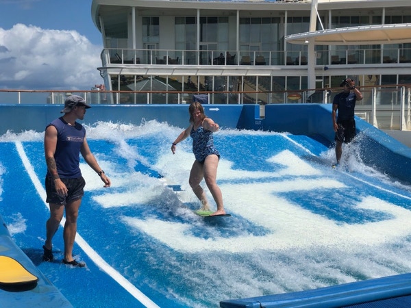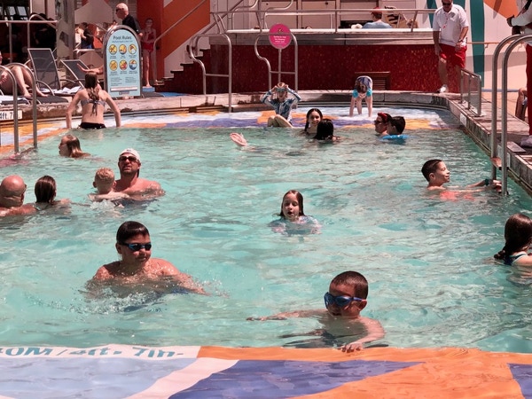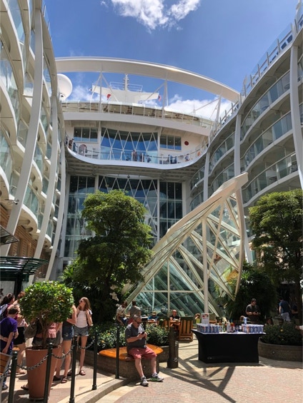 We had the buffet breakfast at the hotel and hung around until about 11:00 when we checked out of the hotel and called for 2 Lyft rides. Barbara, Jay and Jeff had a friendly, flirty woman driver named Vinda. Anne, Chris, Henry and Jamie had the driver from hell. Shlomo (an apt name) got lost, honked at and almost hit. Anne wrote an honest review and got a $5 credit for the bad experience. We met inside the port terminal and were amazed how how efficient the embarkation was. Embarkation day is busy and crazy onboard and sometimes the elevator wait is a little long with the hordes of people using them. We went to the Windjammer buffet for lunch and then walked around checking out the ship. It’s really amazing—like a small city on the sea. The schedule shows many trivia games each day and the ship is just buzzing with all the cruisers seeming to want to fill the entire day with activities. The boys went swimming and the adults familiarized themselves with the ship. Finding your cabin is more challenging than other ships we’ve been on that have long, straight hallways. These have all kinds of turns in these hallways but the signage is pretty good. There are only two sets of elevators (but 24 elevators in all). We had an early dinner at the Central Park Cafe, which we’d read had the best beef au jus sandwich on any ship. It wasn’t anything special, but it was fast. Jay and Barbara spent about an hour fixing problems that turned up. Royal Caribbean has a very useful app that we all downloaded before we left home. Show tickets are on it as well as your own calendar with all the activities, events, dining and shore excursion reminders. You can also see the dinner menus. The problem was that we had booked some complimentary shows a couple months ago. We all had Mamma Mia tickets, but the other two shows were only on B & J’s app so we had to go to Guest Services. Luckily the tickets were still available. The other problem was that Jay hadn’t gotten his bag by 6:00 so we called and were told that he had a prohibited item in his checked bag. We went down to security and saw lots of bags and many irons that had been confiscated. Jay’s crime was having an extension cord. The guy said it was a fire hazard, but I told him we’d just been on a cruise and had the extension cord on our desk entire time (so we could charge more than one device at a time). Maybe the smaller ships on HAL have more lenient rules. They will give it back to us at the end of the cruise. We went to the Amber Theater to see Mamma Mia about 7:30 for the 8:00 show. It was a very professional performance and the actress playing the mother, Donna, had an outstanding voice. It lasted about 2 and 1/2 hours and the boys made it through the whole thing! They’re both familiar with the story and hopefully didn’t totally get the more explicit parts. Barbara was glad she had brought earplugs as the play was SO LOUD! The adults tried the casino for a short time—fun but no wins.