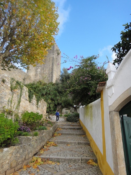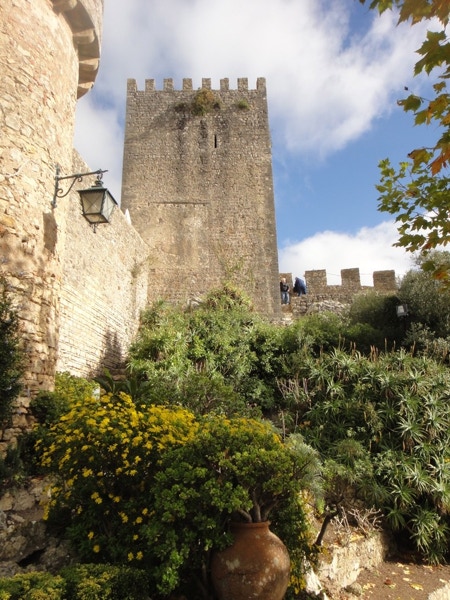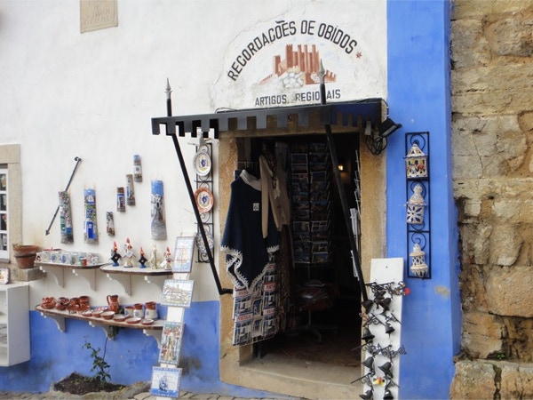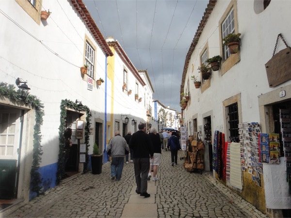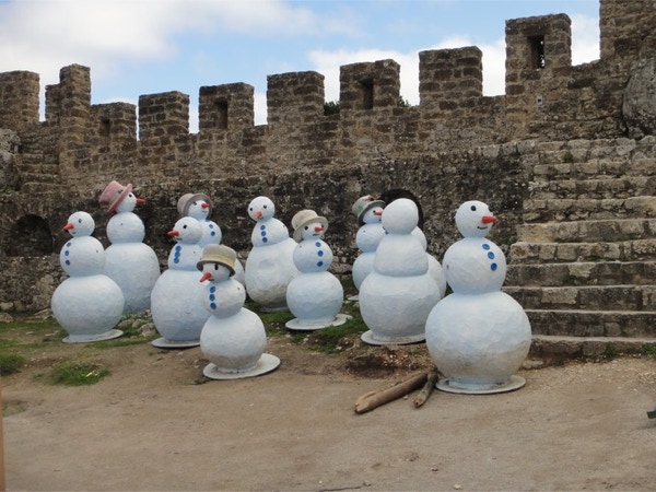November 18, 2012 — On Sunday, November 18th, we went on a shore excursion to the medieval town of Obidos. The town is about 60 miles north of Lisbon and was a marriage gift to Queen Isabel in 1282. A tradition in Portugal is drinking cherry brandy out of tiny chocolate cups (you drink the brandy and then eat the cup). We bought some of each in Obidos and enjoyed them after dinner with Lynn and Jim. A strange tradition in this small town is to cover the town with fake snow in winter. It almost never snows here, but they had some artificial snowmen ready for display.