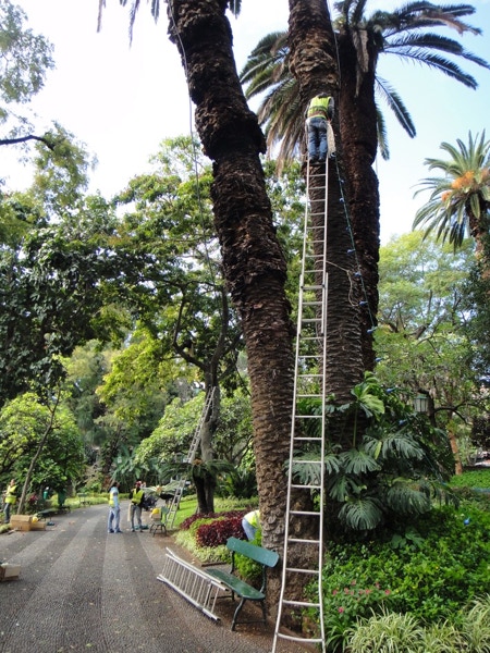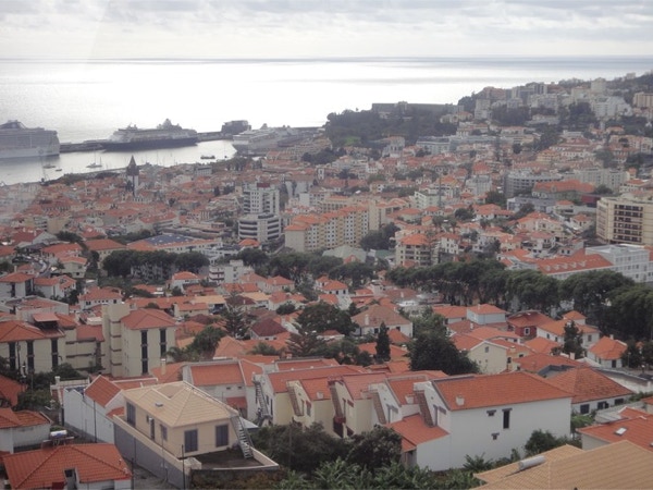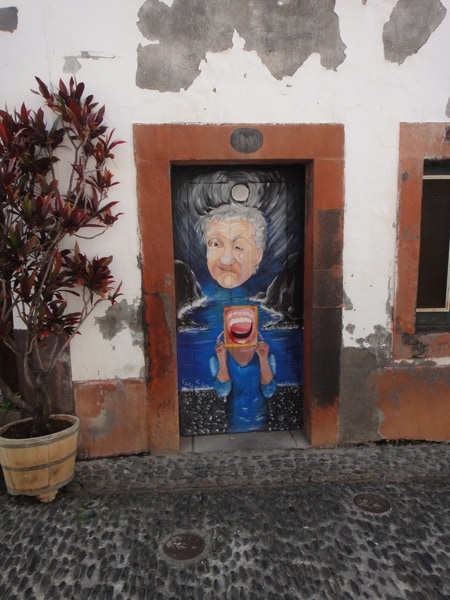 November 20, 2012 — On Tuesday we were in Funchal, Madeira. Funchal is named for the fennel plants that were growing all over the coastal area when the Portuguese first arrived in the 16th century. Madeira is the largest island in this archipelago (it is small at 35 miles long and 13 miles wide) that belongs to Portugal. We went ashore and took a cab to Old Town, where many doors were colorfully and artistically painted. After coffee in a cafe, we walked through the market and then took the cable car up to Monte. Funchal is a hilly city and the red-tiled roofs are striking. There are many gardens and they are terraced because of the steepness of the hills. We had lunch at a classy restaurant--we all tried a local specialty, a soup made of tomatoes, onions and a poached egg. It sounds strange but was very tasty.