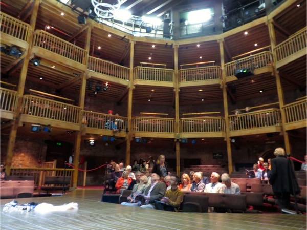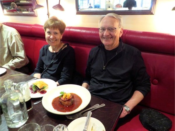 We had one last good breakfast with the Lyndalls at Ashbourne House in York. Paul and Julie were very nice, and though there isn’t air conditioning at the B & Bs we’ve stayed at, the room here had windows that opened and a nice ceiling fan. The parking was especially cramped, and you left your keys with Paul so he could move cars. All the places we’ve stayed at make it a challenge to dry and curl your hair, as bathrooms are like cruise ships and have no outlets for anything but shavers. Many B & Bs don’t have a mirror in the bedroom near an outlet either, so it isn’t always easy. We left York after breakfast to drive to Stratford Upon Avon, arriving a little after noon. This was the easiest drive of any as it was mostly 3 and 4-lane roads, with only short sections of 2-lanes. Jay drove the 150 miles in about 2 1/2 hours. Gayle had emailed us that they hoped to be on the train from Liverpool that arrived in Stratford at 12:41, so we drove to the train station and they arrived just a few minutes later. Back to Arden Way Guesthouse, where Jeanne had our rooms ready. We walked a short distance to Le Pierre Bistro, where we had a nice lunch of salads (Jay had steak and frites and Jerry had pigeon in puff pastry for an appetizer). After lunch the Dustruds went for a walk around town, and we drove about a mile to Anne Hathaway’s (Shakespeare’s wife) Cottage with the Lyndalls. The exterior is very attractive and the gardens beautiful (we were in Stratford and Bath many years ago but don’t remember exactly where we went—it was before the time of digital cameras and Jay uploading and labeling pictures every evening). We met up with the Dustruds and all walked across the Avon to an Italian restaurant called Carluccios. We had very good food and good-humored waiters. After dinner we walked the short distance to the Royal Shakespeare Theatre where we saw The White Devil in the small Swan theatre. It was quite a strange story and none of us totally understood why they were all killing each other. We were in the first and second rows, right next to the thrust stage, and at one point Jerry became part of the show when a note a character was talking about was dropped, intentionally, in his lap. The actors were only a few feet from us at times, and they often made eye contact. It was a unique theater experience for all of us. We were all tired and went to bed after our short walk from the theater to the B & B.