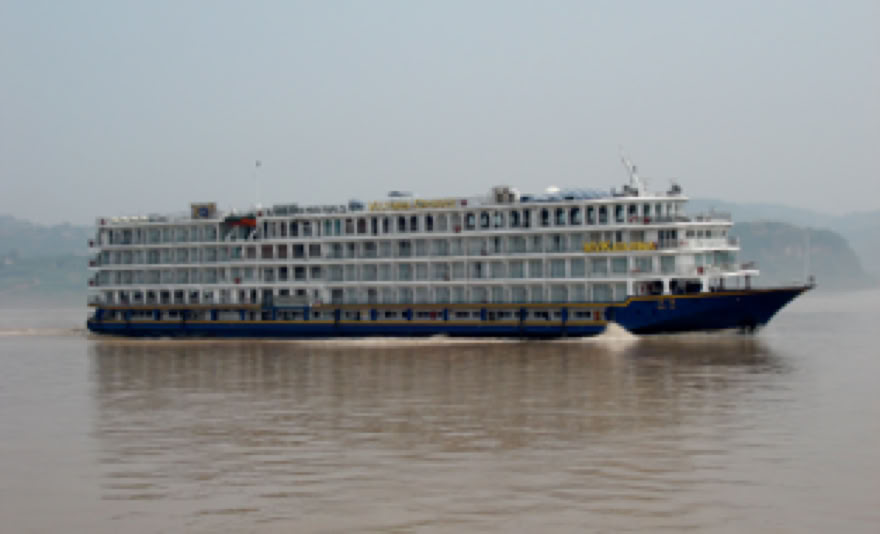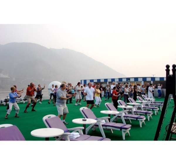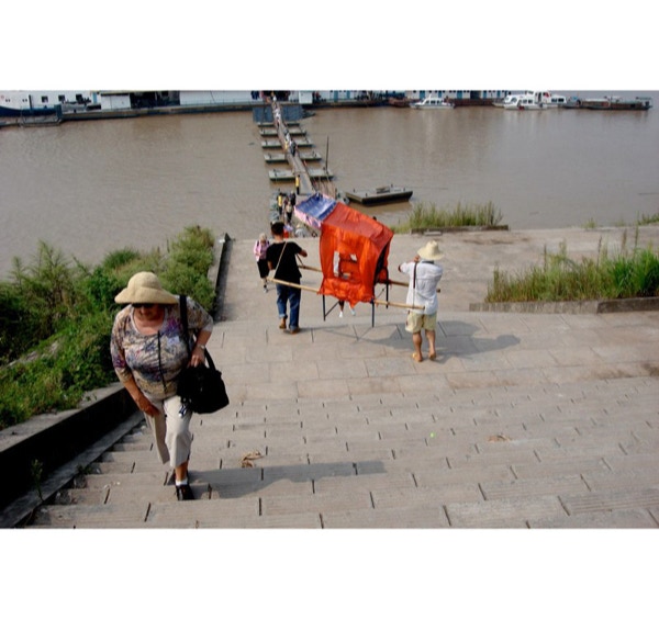 This morning after a buffet breakfast we attended a lecture on the Yangtze River, followed by a lesson in speaking Chinese. The language is difficult because it is a tonal language using four different tones. The word “ma,” for example, can mean mother, linen (or numb), horse, or ‘to swear’ depending on the tone. We practiced some common phrases and the numbers 1-10. It was fun, but some of us didn’t retain much of the information. Our group had lunch together in the dining room, then some went on a short shore excursion to the relocation town of Fengdu. We had to climb 205 steps to get from the boat to the tour bus. It wasn’t as bad as it sounds, although the temperature approached 100 F and the humidity was very high. For about $7 U.S. you could be carried up the steps in a sedan chair. We only saw one lady doing that. Most of the steps will be underwater when the water level of the river rises as the dam project nears completion in the future. New Fengdu is a town of contrasts. We visited a market that seemed very unsanitary, but a short distance away was a four-star hotel. The town is only 16 years old and has a population of 780,000, and many people live in high-rise apartments. Fengdu is considered to be part of Chongqing, which is some distance away. About 70,000 residents were forced to relocate from the old city of Fengdu (now underwater) across the river. Leaving their homes was very difficult for the relocated people but the standard of living seems to have improved for most, as they now have larger homes with more conveniences. The senior citizens gather daily in public places to sing and dance. We listened to them sing “Red River Valley,” Jingle Bells” and other songs familiar to us but sung in Chinese. They were delightful and seemed happy with their lives in the new city. Back on board, we had a Welcome Reception dinner and a Chinese performance this evening.