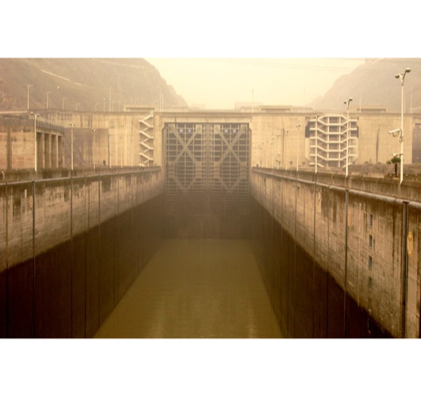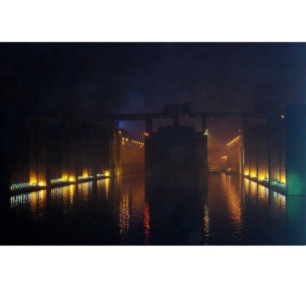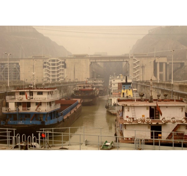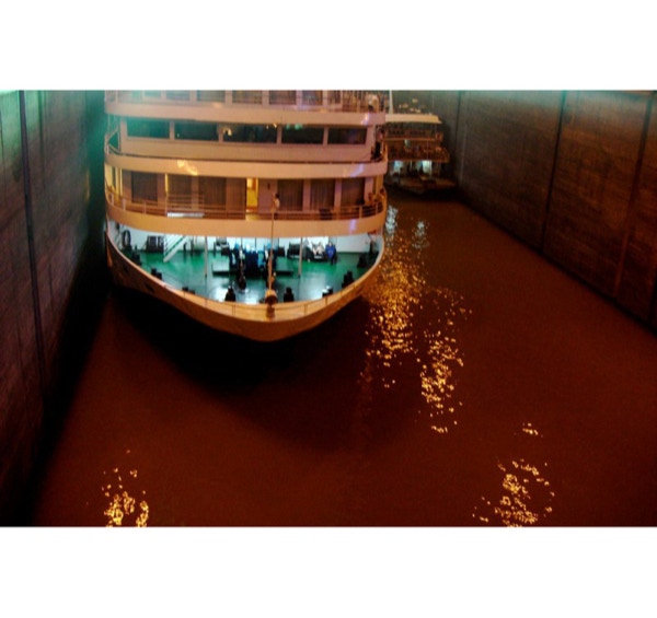 This morning we sailed through the Qutang Gorge, the first, shortest and most narrow of the three gorges. We then boarded a smaller boat to cruise the Daning River to see the Lesser Three Gorges that are named the Dragon Boat, Misty and Emerald Gorges. This trip started at the town of Wushan. Grace, one of the local guides on this boat, lives in the town and told us that the old town is now 70 meters underwater. The river was raised that much in 2003. and will be raised another 30 meters until the river is 175 meters above sea level. About 40,000 people from the old town plus 40,000 from rural areas live in the new town of Wushan. In all about 1.3 million people had to be relocated because of the Three Gorges Dam project. One of the highlights of the lesser gorges was the Ba hanging caskets. The Ba people 2000 years ago thought it was good to be closer to heaven when you die, so they hung the caskets high on the cliffs of the gorges. We had a barbeque picnic lunch along the river that included ribs, sausages and chicken wings. We returned to the Century Sun late in the afternoon and cruised through the Wu Gorge, the second of the three large gorges. Tonight we had an excellent Chinese dinner with numerous tasty dishes. They will serve two Chinese dinners over the course of the cruise and the rest of the time they serve Western-style foods. At about 9:00 pm our ship entered the first lock of the Three Gorges Dam. It wasn’t well lit, so we didn’t get any good pictures. There are five locks, only four of which are now in use because of the low water level. It took several hours to pass through all the locks, and Barbara was the only one of our group who watched the ship go through the second lock.