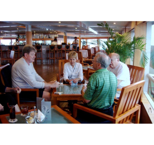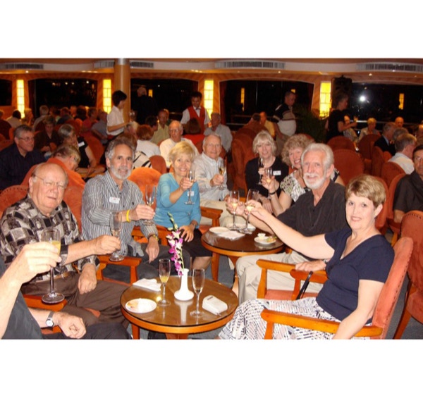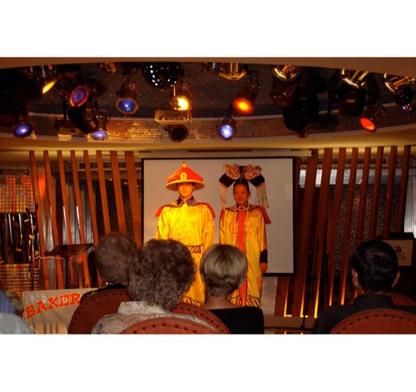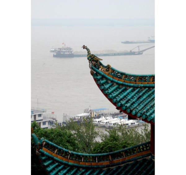 The weather today was windy and cool, and our shore excursion was delayed an hour because of it. We took a bus through part of the city of Yueyang, which is the second largest city in the Hunan province. Chairman Mao was born and raised in this province. The city of Yueyang has a population of 5.4 million, which is a medium-sized city in China, although it has more people than the entire state of Minnesota. Our destination was the Yueyang Tower on Dongting Lake, the second largest lake in China. The original tower was erected in 716 A.D., but the current tower was built in 1985. The tower is famous because the poet Fan Zhongyan wrote a poem about it in 1045 A.D. We visited a tea garden near the tower and were served an unusual green tea whose long leaves rise and fall in the hot water. We had a lot of fun tonight at dinner talking about our signs of the Chinese zodiac. There are two tables for ten in the ship’s only restaurant and we have been able to get one at the back of the dining room for our meals. We are enjoying everyones company and are getting to know Paul’s friend Jack, who’s a great guy. Tonight we did a little dancing in the Observation Lounge.