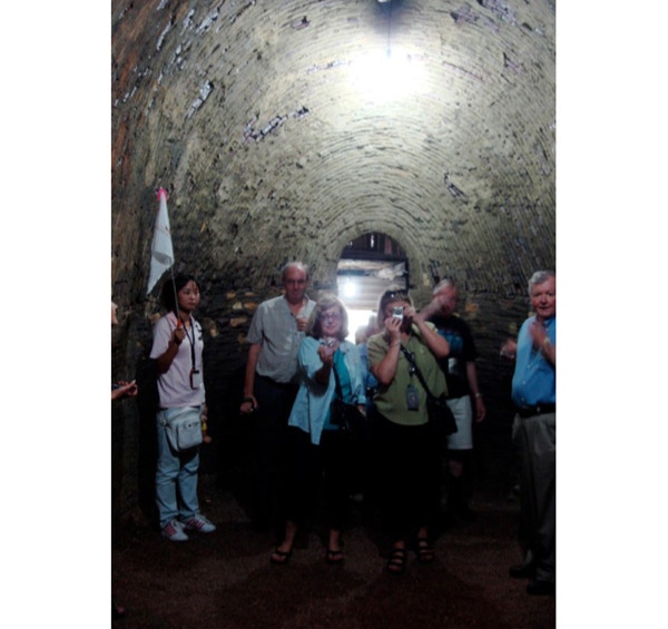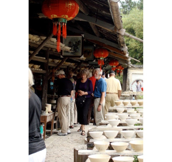 Our ship is docked in Jiujiang, a city of about 4.6 million known as the City of Nine Rivers (the number of rivers may be exaggerated). We were on the bus for over two hours, traveling along an expressway to the city of Jingdezhen, passing many rice paddies, pearl farms and Lake Poyang, the largest lake in China. Jingzezhen is known as the Porcelain City. There are porcelain light posts on the roads into the city. Like Jiujiang, it has a population of over 4 million, and both cities looked more prosperous than others we have seen along the Yangtze. We visited the Ceramic Historical Museum where we saw demonstrations of the old way of making porcelain pottery. Five hundred year old kilns were part of the museum, and we were able to walk inside a large one. The museum was located in a pretty area with gardens, streams and bamboo groves and we had time to walk around to take pictures after the tour. We had lunch at a restaurant in a Jingdezhen hotel, then went to the porcelain market, which consisted of countless stores all selling porcelain. Most of the local residents are employed by the porcelain industry. Back on the ship we had another Western dinner and then watched the Crew Cabaret Show. It was very enjoyable as our friends Cicy, Jessica and Vivian (lovely voice) participated.